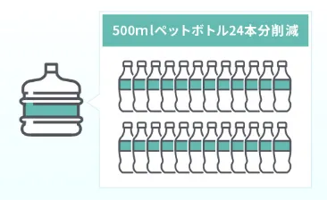アクアクララボトルのレギュラー(12L)1本を、500mlのペットボトルに換算すると24本分。つまり、回収型のリターナブルボトルを1回使うと、ペットボトル24本分のゴミの排出を抑えることになります。