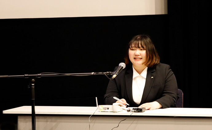会場では実際にお客様対応を再現。お客様役のスタッフを相手に、コミュニケーションをとります。ボトルの持ち運び方をはじめ、言葉づかいや表情、傾聴力、提案力、説明力などが審査されるのですが、オリジナリティや好感度も評価の対象になっています。