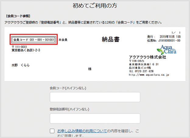 納品書等に記載の12桁の「会員コード」とアクアクララにご登録の「電話番号」をご入力ください。