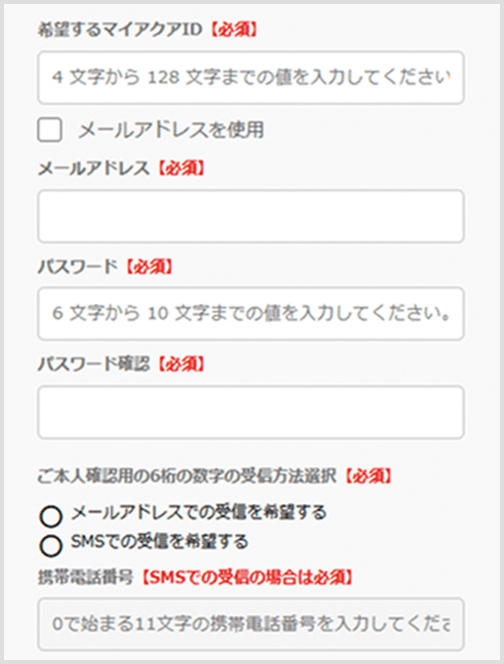 「マイアクアID」、メールアドレス、パスワードを入力し、ご本人確認用の6桁の数字の受信方法を「メール」または「SMS」からお選びください。