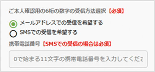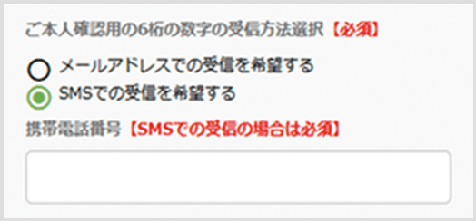 ご本人確認用の6桁の数字を登録ステップ2で入力いただいた携帯電話番号へ送信しますので、ご確認をお願いいたします。