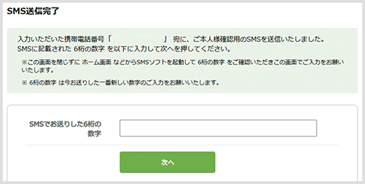 登録ステップ3でご入力いただいたスマホ宛にご本人確認用のSMSを送信いたします。6桁の数字をご入力いただいた後、画面一番下にある「次へ」を押してください。