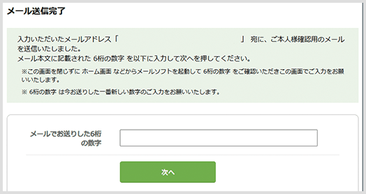 登録ステップ3でご入力いただいたスマホ宛にご本人確認用のメールを送信いたします。6桁の数字をご入力いただいた後、画面一番下にある「次へ」を押してください。