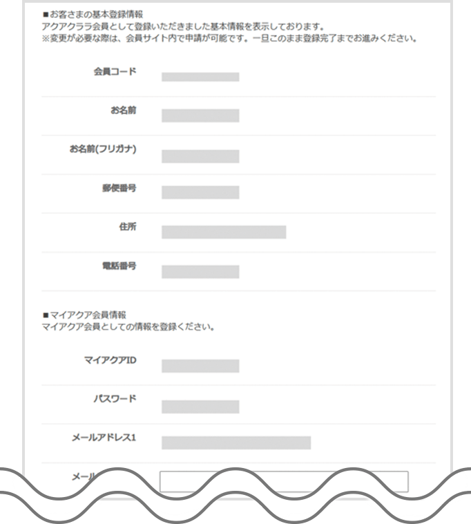 登録済みの基本情報が表示されますので、内容をご確認ください。続いて「マイアクア会員情報」の必要事項を入力してください。