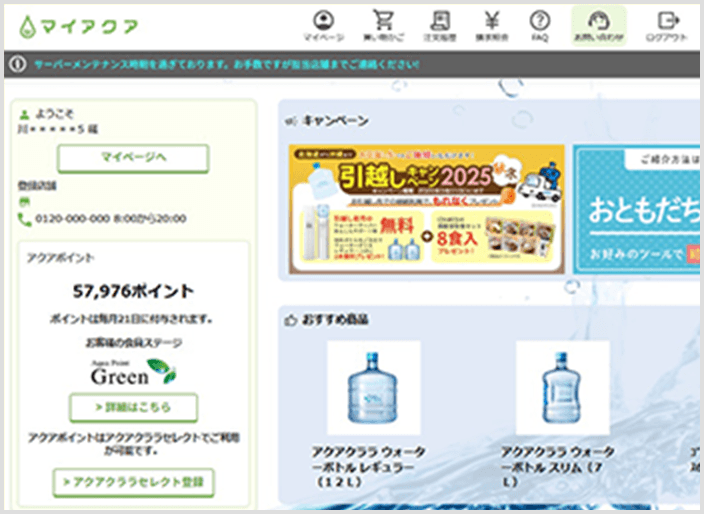 - 「マイアクア」にご登録前のアクアクララご利用分については、ポイントは付与されません。