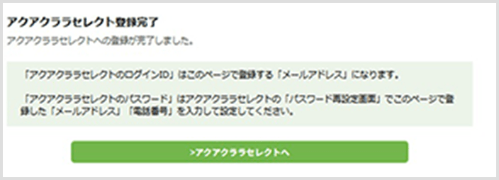メールアドレスと新しいパスワードを設定することで「アクアクララセレクト」の登録が完了します。