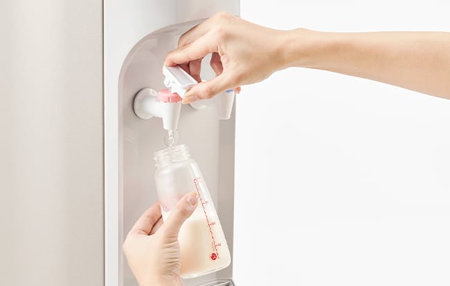 アクアクララのウォーターサーバーは、いつでも必要なときに温水を出せるからミルク作りにとっても便利。しかも温度はミルク作りに十分な80~90℃。安心して赤ちゃんのミルクを作ることができます。